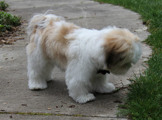 All was copacetic until puppy man realized there were two large, never before seen, LIVE creatures in front of him. Friends, it was a sight to behold. Imagine, if you will, someone simultaneously scared out of their wits and yet so consumed by curiosity they can't resist going forward. You know, kind of like those horror movies where the person just HAS to go down in that basement? That was Mochi. His back legs were furiously scrabbling to gain purchase and move him backward while his front legs were simultaneously trying to propel him forward. Who knew that was even possible? There were huffs and growls, and lots of flying gravel. Finally, laughing, (I know. I'm sorry, but it was funny.) I picked him up. Of all the times not to have the camera with me.